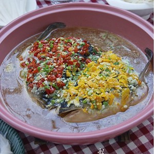 将姜粒、蒜粒、黄金剁椒和红剁椒依次抹在鱼头。