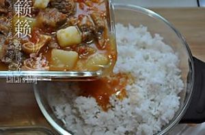 剩米饭将其打散,摆放入格拉斯烤箱耐热玻璃锅中备用;将番茄炖牛腩铺盖在剩米饭上面;