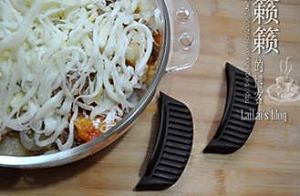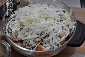 将马苏里拉奶酪条手撕成条丝状,平铺在番茄牛腩上面;