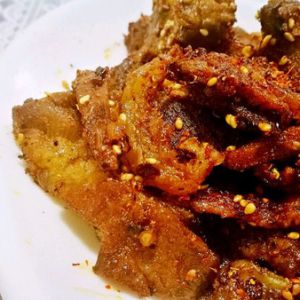 放入锅中爆炒三分钟(盐、味精、鸡精、白芝麻、生抽、干辣椒、蒜)