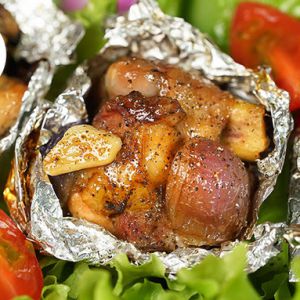 将鸡块、红葱头、蒜片放在锡纸上,使锡纸完全包裹住食材,放入烤盘中