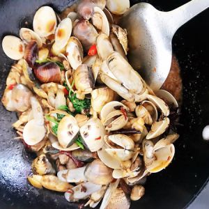 1、倒入食材花蛤,翻炒2分钟,同时加入少许水、料酒、生抽、啤酒、蚝油、白糖