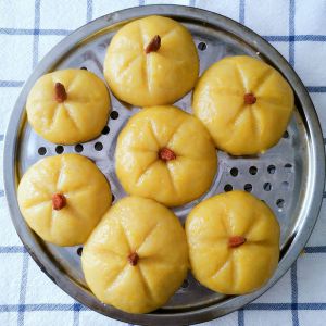 取一小块面团做成饼状,用牙签压出南瓜纹路,再放一颗枸杞。