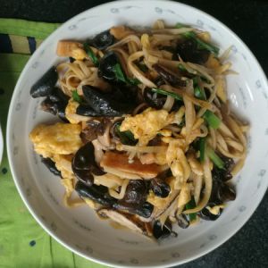加入事先切好的茭白丝黑木耳腊肠进行翻炒,加入适量的盐,然后加入少量水盖锅盖焖一会。