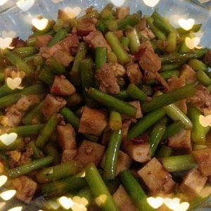 炒出豆瓣酱香味后,入豆干小炒,再入蒜苔。大火偏炒后改小火。