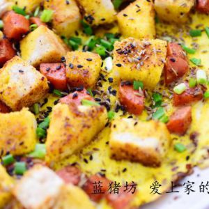 锅烧热放入切好的馒头丁,烤至焦黄后倒入食用油,煎至焦黄后放入火腿丁,盐,孜然面和辣椒面搅匀