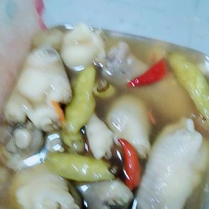 把焯好的鸡爪放入冰水中冰一下,拿出来放进一个玻璃罐中倒入调好的料汁,拿保鲜膜封住,放三天就可以吃了,也可以放七天比较入味。