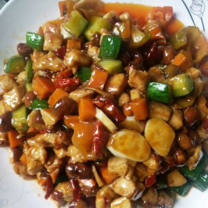 锅里发放油,郫县豆瓣酱,姜蒜,花椒,辣椒段,炒香,倒入配菜,鸡丁,翻炒两分钟,倒入淀粉汁,翻匀即可起锅,