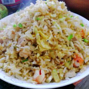 (炒饭最好放猪油才会更香)在把其余材料入锅炒7成熟,放点调味盐