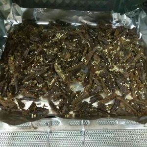 完成后,颜色加深了,外焦里嫩,还有水分,不会很难嚼,撒上芝麻,完工,装盘,出锅,祝大家2018年新年快乐!
