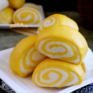 用同样的方法做黄色馒头坯:黄色在下,白色面片在上,卷、切,然后上屉码好,盖上盖子饧20分钟