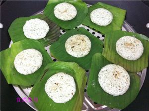 芭蕉叶涂抹一点食用油,放入艾饼,大火隔水蒸15分钟即可。