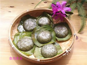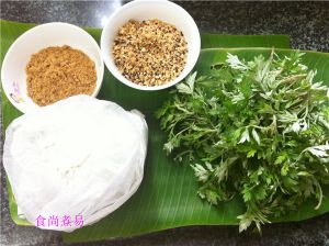 食材:糯米粉、红糖、炒熟的花生米、黑芝麻、艾草、芭蕉叶。