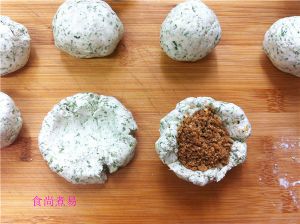 压扁,面团中央形成一个凹形,放入馅料。