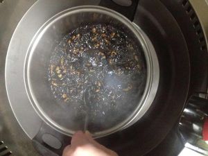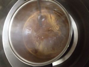把那一盆倒入锅中搅拌均匀,不停搅拌,要开小火,最好有个帮手,因为你要去做下一步!
