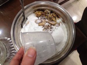 把芝麻、核桃仁、冰糖粉放在一个盆那,要多放点芝麻和核桃,糖的话可以按个人口味