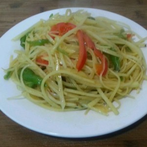 大土豆用了一个,搭上配料约两盘菜,土豆刮皮,清洗干净,切细丝,也可以切片!用清水多洗几遍!