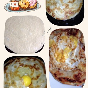 打入一个鸡蛋放在表面(也可以把饼划开鸡蛋倒入)。有时候我会加点榨菜碎在里面 也很香