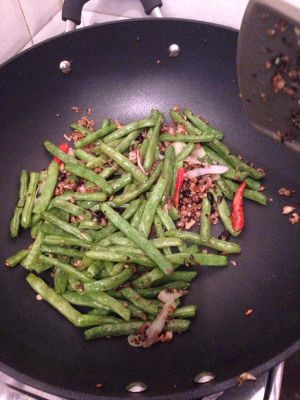 下炸好的四季豆,翻炒几下,加盐,糖,鸡精炒均勻即可