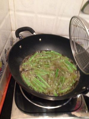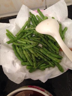 四季豆去老筋,洗净沥水抹干,起油锅炸微皱