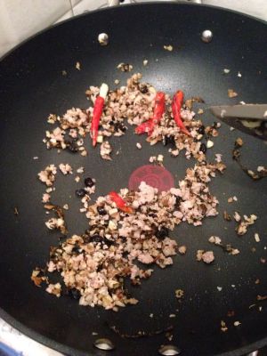 炸油留少许炸香猪肉碎,梅干菜,姜,蒜,豆豉,辣椒干,我家没干辣椒,放了小辣椒,香喷喷豆豉,梅干菜边炒边嘴馋…嘻嘻嘻