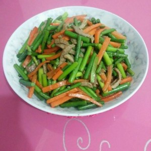 油加热后放入肉,翻炒后加入酱油,胡椒粉,再放入蒜台胡萝卜,加入盐。翻炒至熟即可