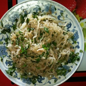 将海蜇切丝,放入水中浸泡4小时,洗净沥干备用。