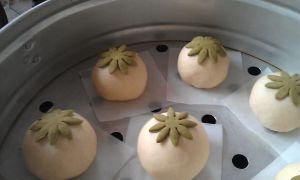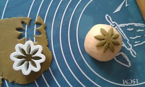 将抹茶面团擀簿擀平,用模具压出花形,底部沾一点水,放在包子上面