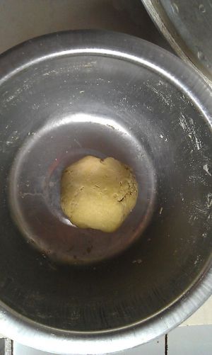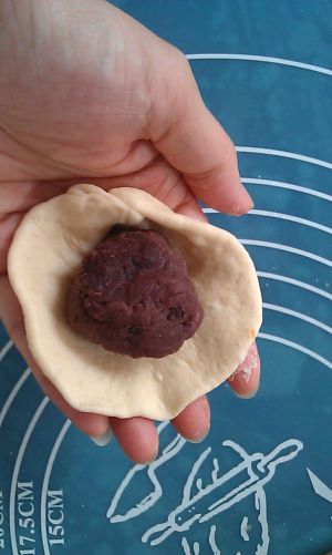 面团擀成圆形,包入30克豆沙馅,收口朝下