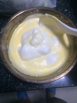 将打好滴蛋清倒入蛋黄面糊里,上下左右搅拌,不能打圈哟~