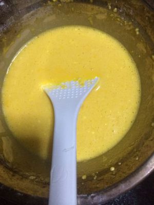 电饭锅壁刷油后预热3-5分钟后将搅拌好滴糊倒入电饭锅,并摇几下放入锅里。注:摇几下是担心糊中间有大滴气泡。