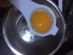 先将蛋清蛋黄分离,分别装入两盆。注意:盆不能有油和水,蛋清分离后不能有蛋黄!