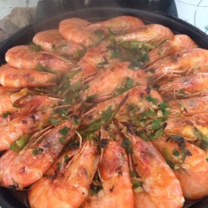在整齐的青虾上撒上备好的葱、姜和辣椒。开始倒入色拉油,沿着虾的摆放顺序倒上一圈,油多一点。盖上上盘焖十分左右即可,如果吃起来味道较淡可以淋上生抽。味道极好~