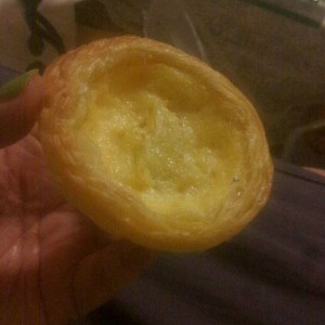 把调好的蛋挞液倒入蛋挞皮中 在取适量的榴莲放入 烤箱预热10分钟 放入蛋挞烤制