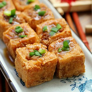 两勺水淀粉,一汤匙生抽,一汤匙蚝油,调好放入锅中。加入刚刚煎好的豆腐泡。