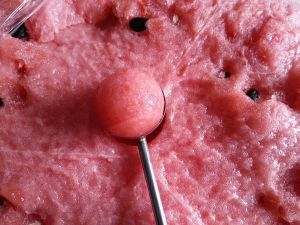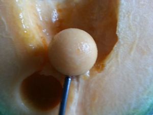 西瓜挖球冻上。我家里都是提前冻好哒!