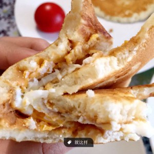 第三步:把鸡蛋放在凉快松饼之间。就完成啦!so easy