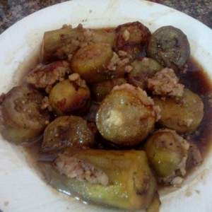 猪肉加淀粉酱油 盐干蘑菇一起去打 然后酿进茄子中间的那个口