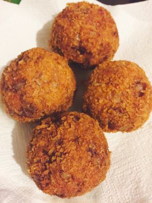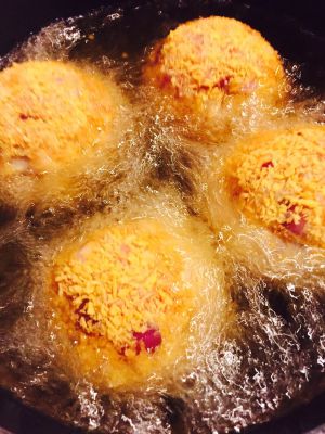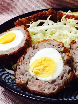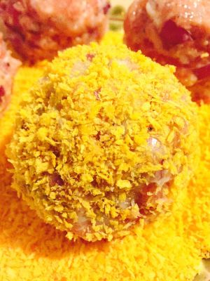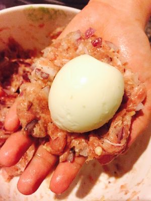 把煮熟剥好的鸡蛋用扮好的肉馅包好