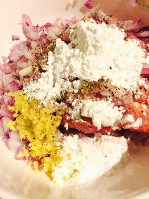 肉馅、盐、胡椒、姜末、洋葱、淀粉搅拌均匀