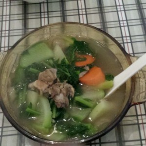 将过水的萝卜放入排骨汤中煮软,加盐调味,然后放菜樱再煮会。清清爽爽一碗汤好了,请享用吧。