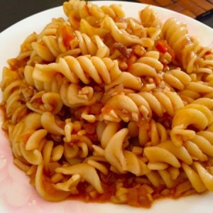由于炒制过程中没有助手拍照,抱歉没有每个步骤照片。但详细步骤如下:锅中放油,热后放入肉米煸炒,待肉米金黄,放入洋葱和蒜末接着煸炒,爆香且炒至没有水气再放入蘑菇,接着放入番茄,番茄会出水,但如果觉得干,就需要加点水。觉得颜色淡,就加一些酱油。最后把煮好的意大利面加进锅里翻炒,放入适量的盐即可出锅。