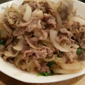 洋葱切丝,香菜切小段。将炒锅烧热,加入羊肉片,铺匀,不要翻动。