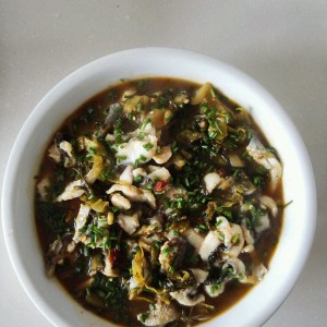 将成品装盘(装盘时要注意尽量将鱼片放在最上层),洒上小葱和香菜。将锅洗净擦干,向锅中倒入适量菜油(如喜欢辣就放入干椒炸),油温八成热后倒在鱼片上。大功告成
