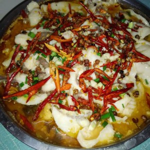 放姜,放蒜,放酸菜下去煮5'6分钟,然后放豆瓣酱,耗油、生抽,放盐,放泡椒煮一分钟,然后全部倒到大盘里,用筷子隔着盘把水倒回锅里,水开后,鱼片一点点快速放下去,等水开后关火让鱼在水里泡十秒,倒,回盘里,在鱼片上面放花椒,放干辣椒,放蒜蓉,放葱