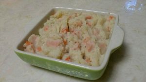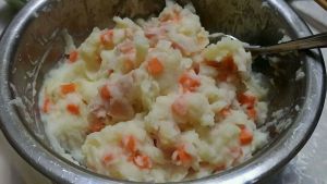 切好的胡萝卜、香肠加入土豆泥搅拌均匀~