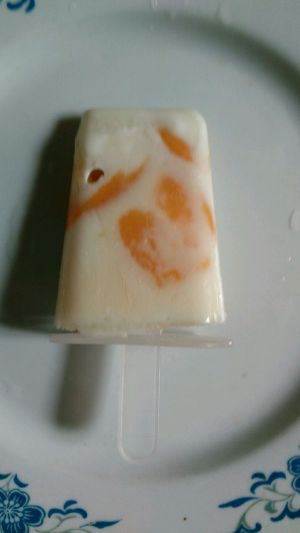 先将黄桃均匀分配到冰棒模中,再将酸奶混合液慢慢倒入冰棒模中,插上冰棒棍放入冰箱冷冻室冷冻,冷冻时间当然是越长越好,我是上午10点做的,下午3点拿出来吃的,已经冻得很好了。