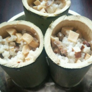 准备好竹子,这是我回乡下砍的。准备了军刀!结果军刀在竹子面前太渺小了。还是柴刀管用。砍下来的竹子用锯子锯成比家里锅矮的竹筒。我准备用电饭锅!!一头要留竹节哟,