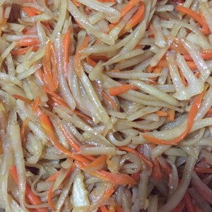 土豆丝变色变软后,加入略多的醋、糖(不能加太早,土豆太脆不好软),醋和糖成正比
