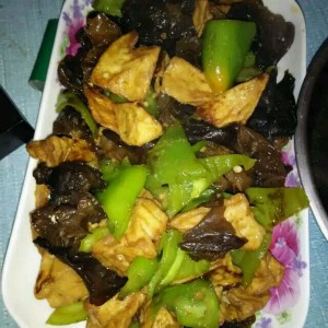 先炒青椒木耳,盐,鸡精,然后再放进炸好的茄子翻均匀就好啦,放点番茄酱味更美
